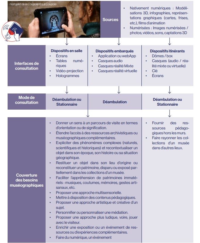 Selon les formats envisagés, le dispositif narratif ou scientifique couvert, la place allouée à ce type de projets, les dispositifs numériques peuvent venir en complémentarité d’un propos muséographique ou faire l’objet d’une expérience et d’une offre dédiée (ce sont notamment le cas de dispositifs numériques souvent appelés abusivement immersifs).